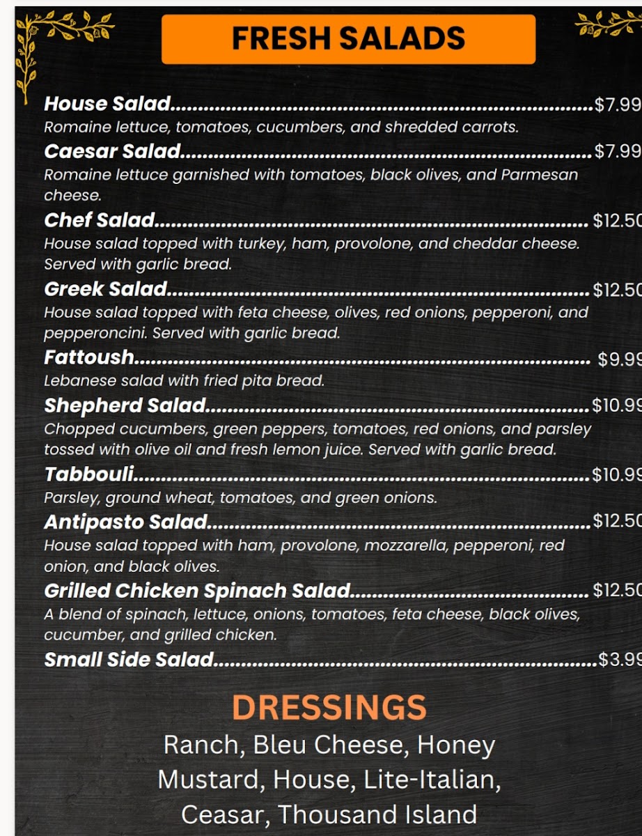 Mixed greens with a choice of dressing including Ranch, Bleu Cheese, Honey Mustard, House, Lite Italian, Caesar, and Thousand Island.