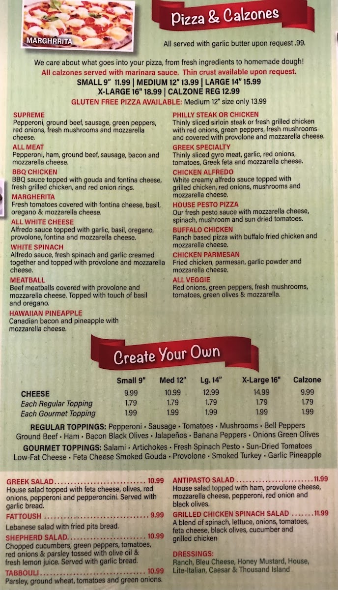 Thinly sliced gyro meat, garlic, red onions, tomatoes, Greek feta, and mozzarella cheese.