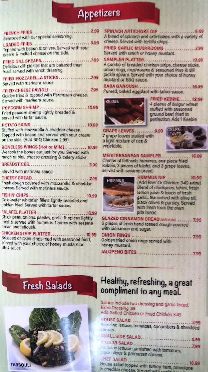 Chopped cucumbers, green peppers, tomatoes, red onions, and parsley tossed with olive oil and fresh lemon juice. Served with garlic bread.